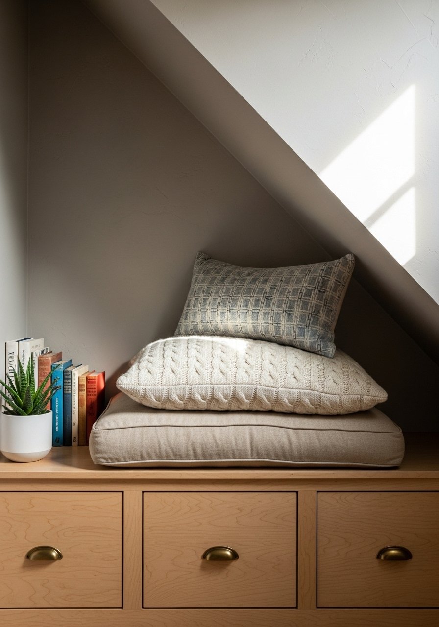 I repurposed the low space into a bench with pull-out drawers. It reads as furniture, not half-finished construction. Use slim drawers or under-bed storage bins for a similar budget option. Styling trick: mix two seat cushions (2:1 texture ratio) and place a brass frame on the wall above. Mistake to avoid: making drawers too deep — you’ll lose headroom.