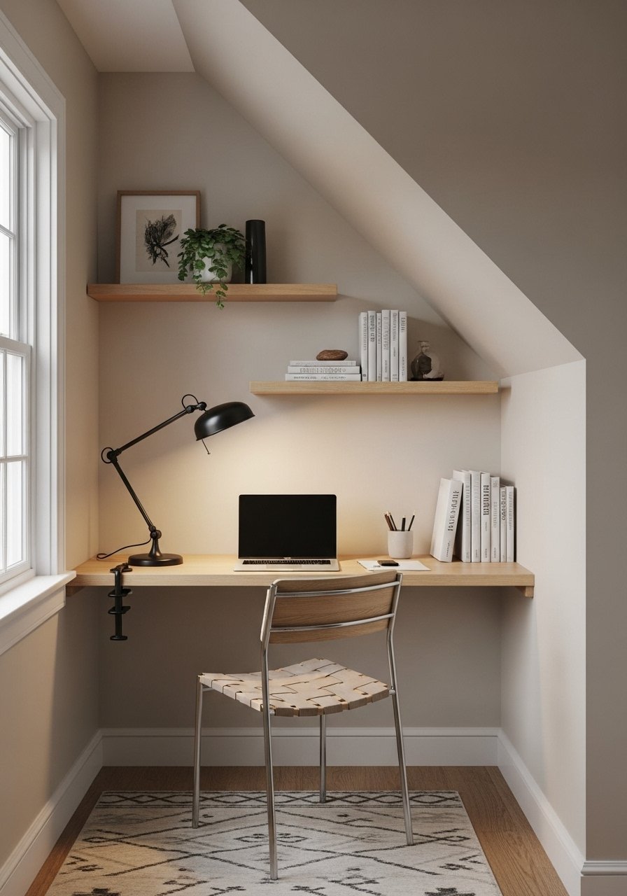 I turned a corner into a desk and it became my favorite spot. Use a slim writing desk or a wall-mounted drop-leaf desk and floating shelves. I recommend white oak floating shelves and an adjustable LED floor lamp. Mistake: placing a bulky chair — choose an armless option to fit the slope.
