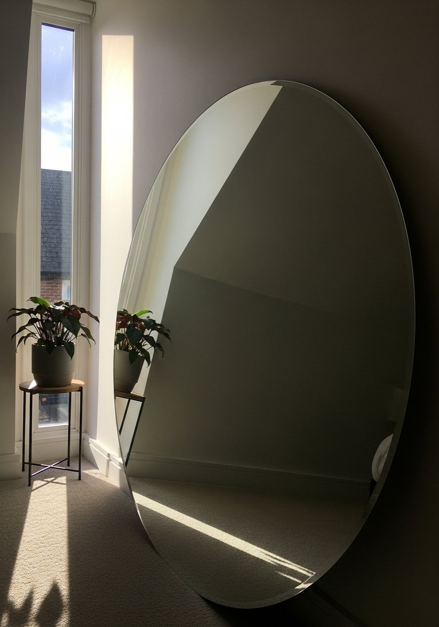 A large mirror reflects sloped ceilings and skylights, instantly opening the room. I used this 36-inch round mirror. Place it opposite a light source. Mistake: using a tiny mirror — it doesn’t move the eye.