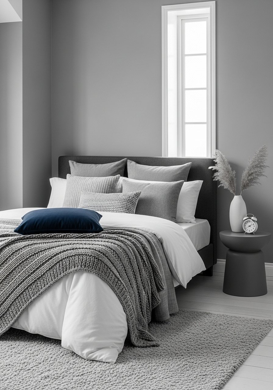 A monochrome base keeps the sloped room serene. I used gray bedding, linen curtains, and one navy pillow for contrast. Use texture (2:1 ratio of soft to structured) for interest. Mistake: relying only on pattern — texture matters more in small spaces.