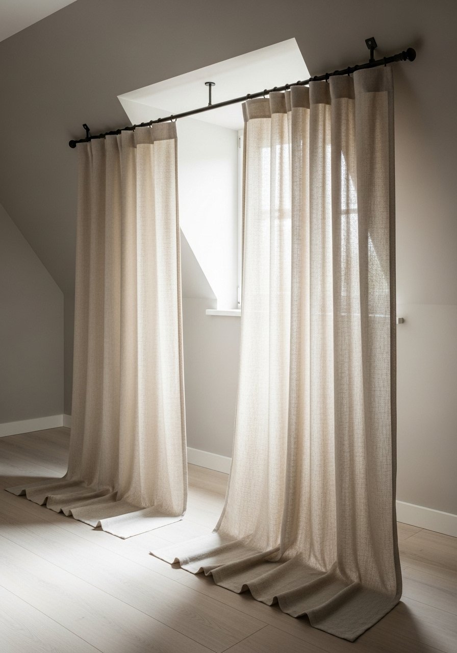 Hang curtains as high as the rafters allow to trick the eye into thinking the ceiling is taller. I mounted 96-inch linen panels close to the peak and they made the dormer feel intentional. For small attic room ideas bedrooms, choose light-filtering fabric to keep privacy without shutting out light. Mistake: hanging too low—curtains must meet the floor (kiss or puddle) for that finished look.