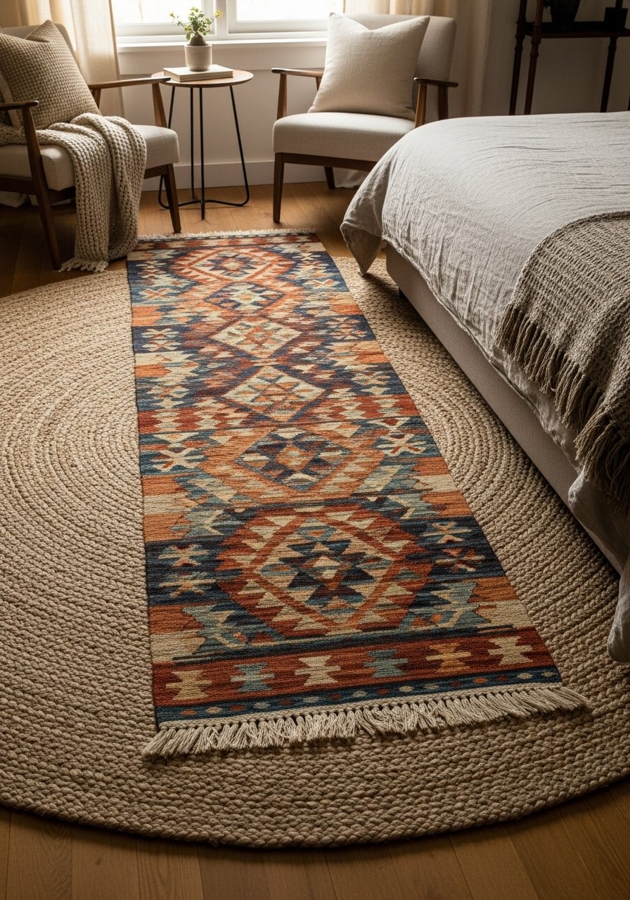 Layer a neutral jute base and a smaller patterned rug to define the bed and seating zones. I used a round jute rug 6-foot under a runner. The texture difference anchors zones and makes the attic feel curated. Mistake: mismatched scale—keep the base rug large enough that the bed legs sit on it.