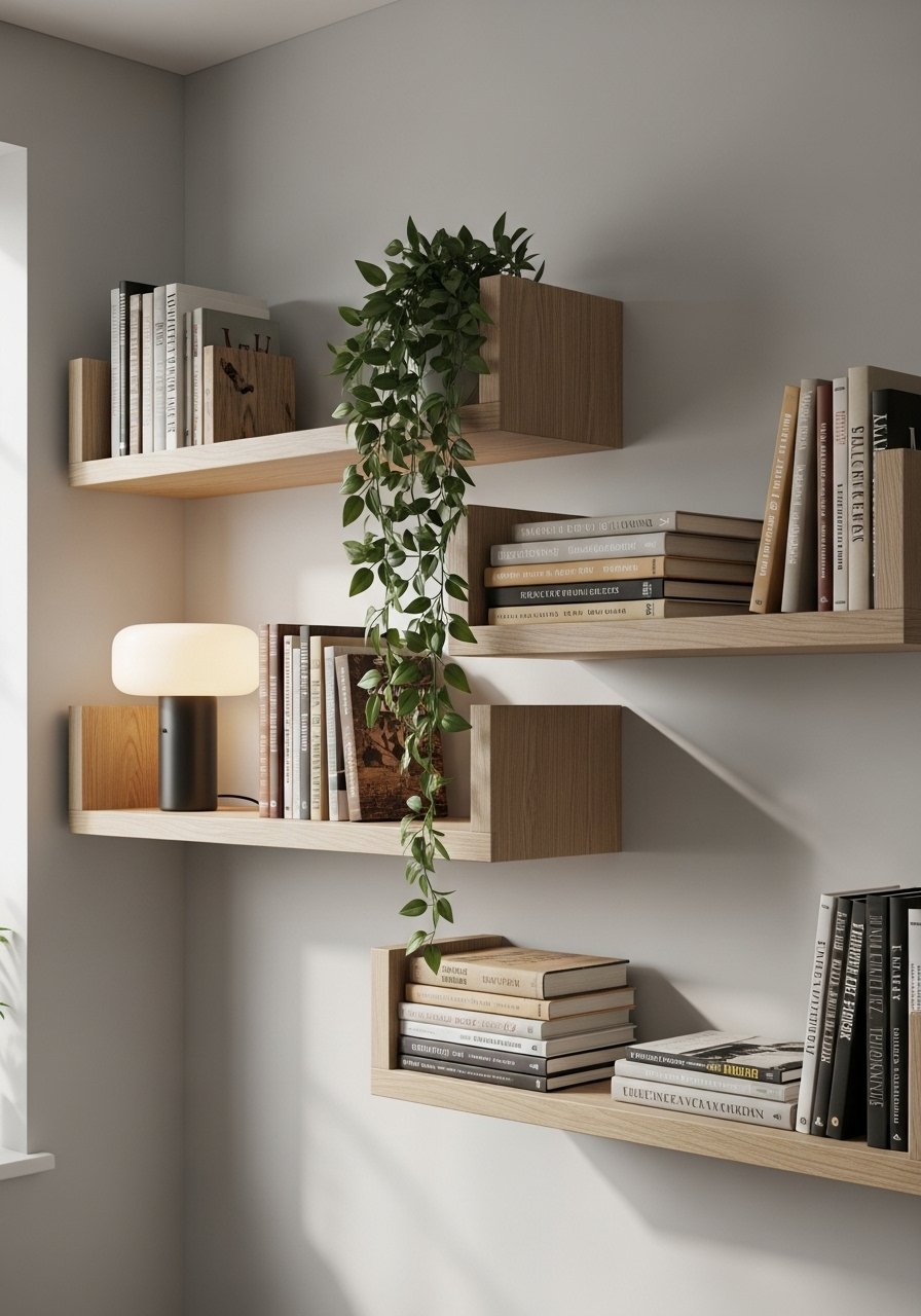 I used staggered white oak floating shelves to draw the eye up and make the slope feel deliberate. Add a pair of trailing faux pothos and a small brass frame. Styling tip: odd numbers and varied heights. Mistake: overloading shelves—leave breathing room.
