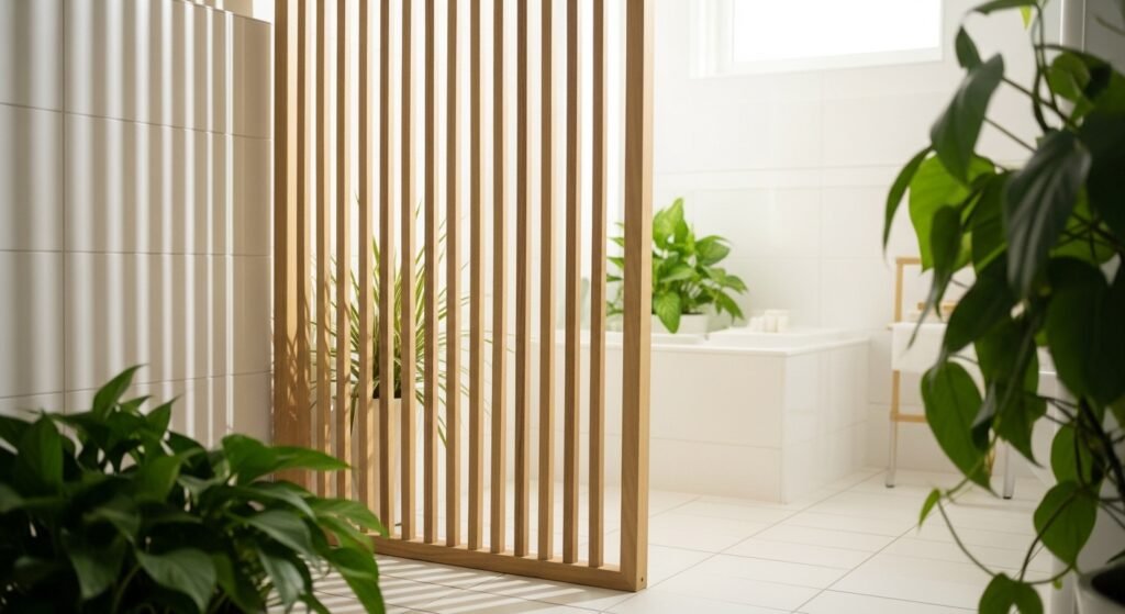 This setup blends a bamboo divider seamlessly with living room furniture and a big plant – adaptable for open-plan bathrooms too. I borrowed the idea for my powder room, pairing it with a thrifted stool, and guests always ask where I got it. It softens harsh lines without crowding the space.