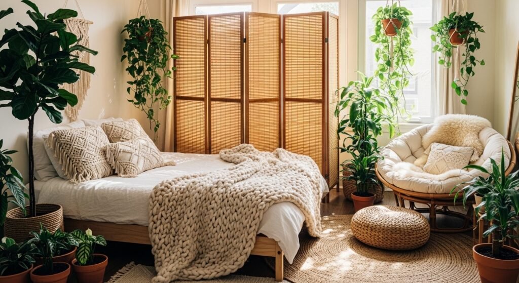 A bamboo divider with a plant in front? Bedroom goals. It softens the edge between sleeping and sitting areas – I added mine next to the bed, and mornings feel like a resort now. Pro tip: mist the leaves for extra humidity.