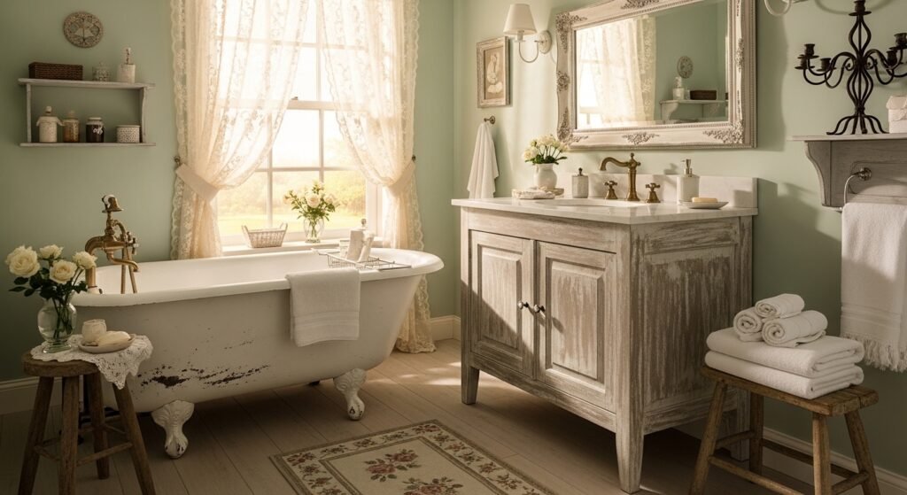 Okay, real talk – start by measuring your space twice because I learned the hard way that a “vintage” vanity won’t fit through a skinny door. Pick soft colors like creamy whites, pale blues, or blush pinks that play nice with your lighting; test swatches at different times of day so you don’t end up with a surprise like my peachy disaster. Mix new fixtures with thrifted finds – sand and paint wood pieces for that shabby chic distress, then seal ’em well to handle humidity. Oh, and don’t skip ventilation; a good fan keeps the vintage look from molding over time. Budget-wise, focus on one statement piece like a clawfoot tub or arched mirror, and build softness around it with textiles – trust me, it feels custom without the custom price.
