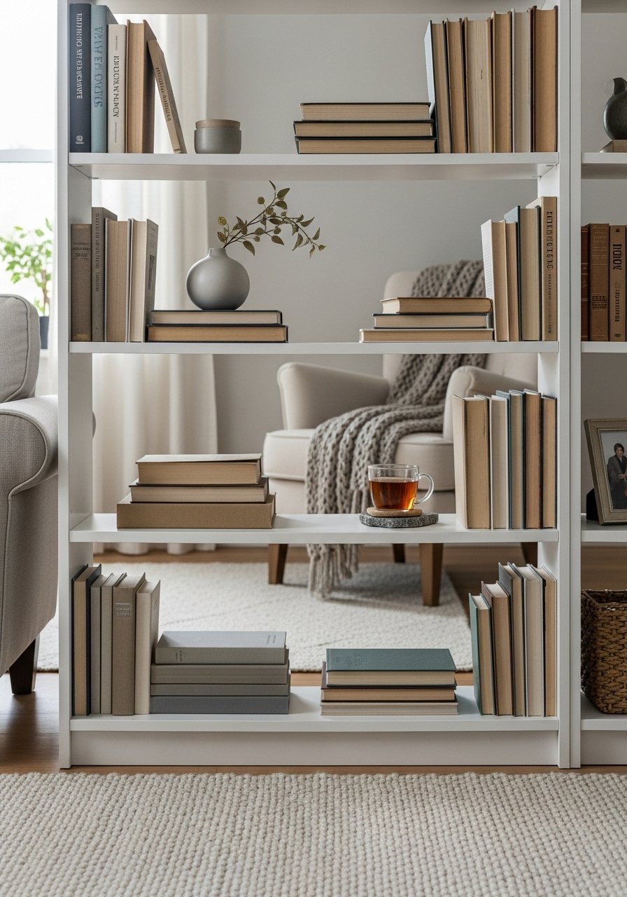 The bookcase room divider is your anchor. I measured traffic lines first. I placed my 72-inch open bookcase so its base sits fully on the rug. That keeps sightlines clean and prevents the unit from feeling like an afterthought. I used this 5-shelf open bookcase in white to keep the space light. Put heavier objects lower. Lighter décor goes higher. The visual rule I follow: 60/30/10 for mass. About 60% empty or open space in the bookcase, 30% books, 10% decorative objects.