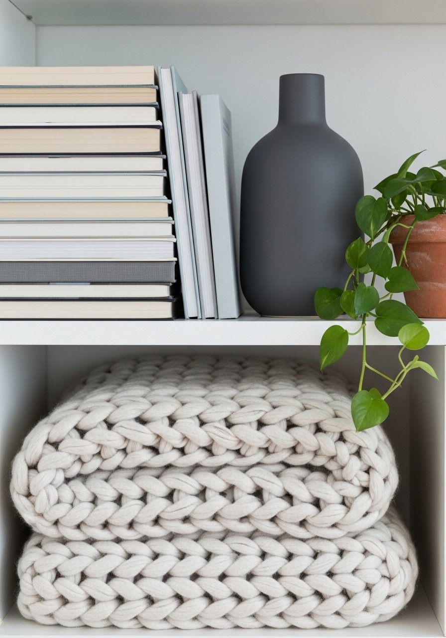 Soft layers soften the visual divide. I layered the seating side with an 8×10 jute rug and added a chunky knit throw on the sofa. On shelves, group books horizontally in stacks of three to five. Top a stack with a small object or candle. Mix materials: ceramic, wood, metal. I used graduated candlesticks and a small ceramic vase to add warm contrast to the natural fibers.