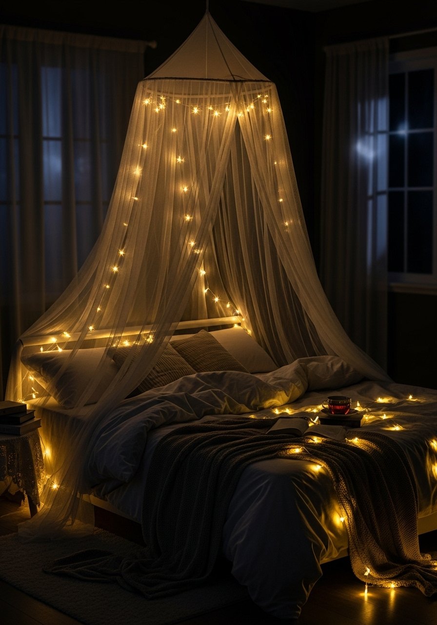 I draped a cheap canopy hoop and added warm LED string lights. The result feels intentional and calming. I recommend warm white fairy string lights and a thin canopy. Avoid overcrowding—one layered light source plus one table lamp is enough.