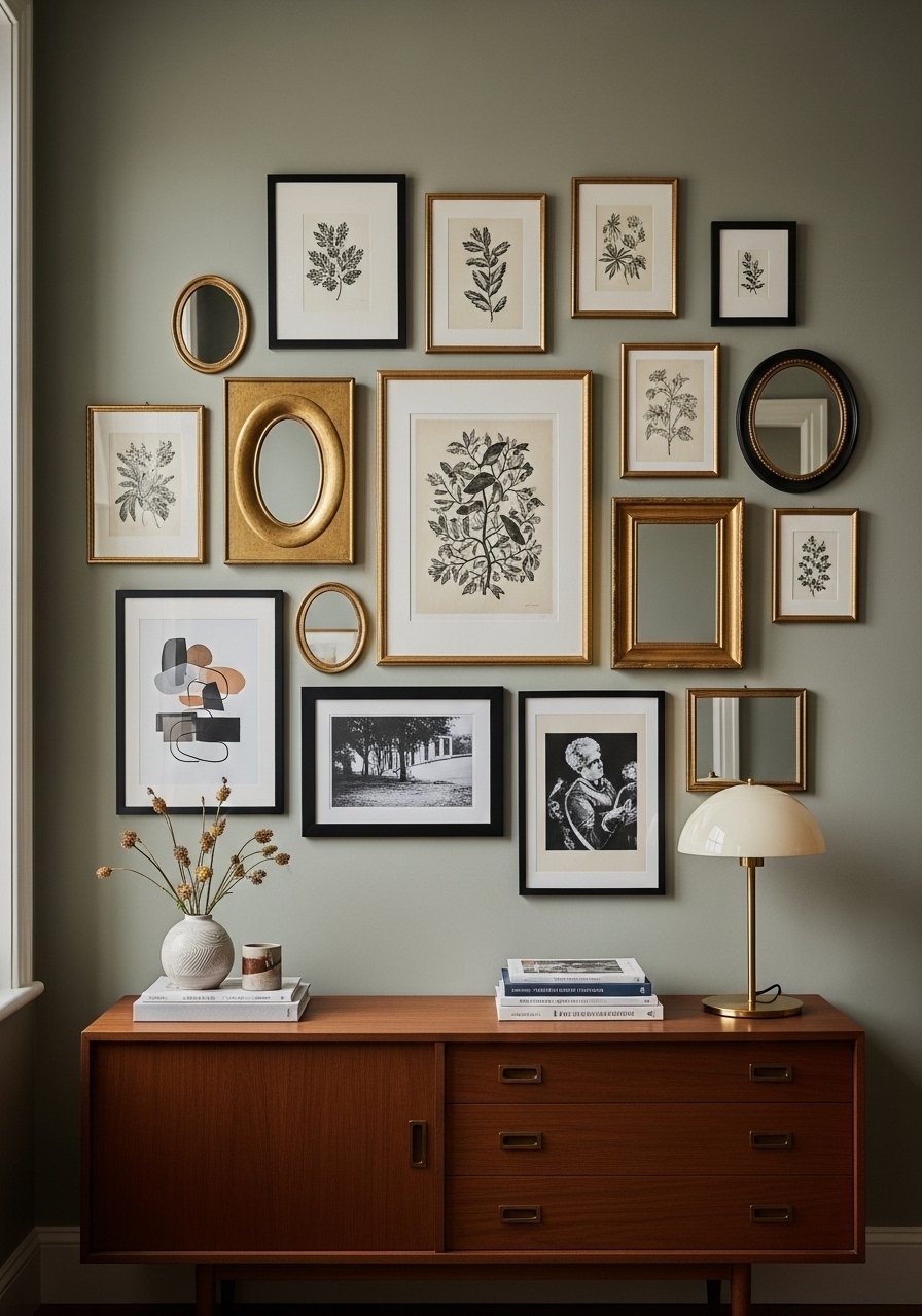 I mixed thrifted frames with new mats and hung them in an L shape. I used vintage-style brass frames 8×10 and bought white mats online. Styling tip: keep two large anchors and fill with smaller pieces using odd numbers. Common mistake: spacing frames too far apart.