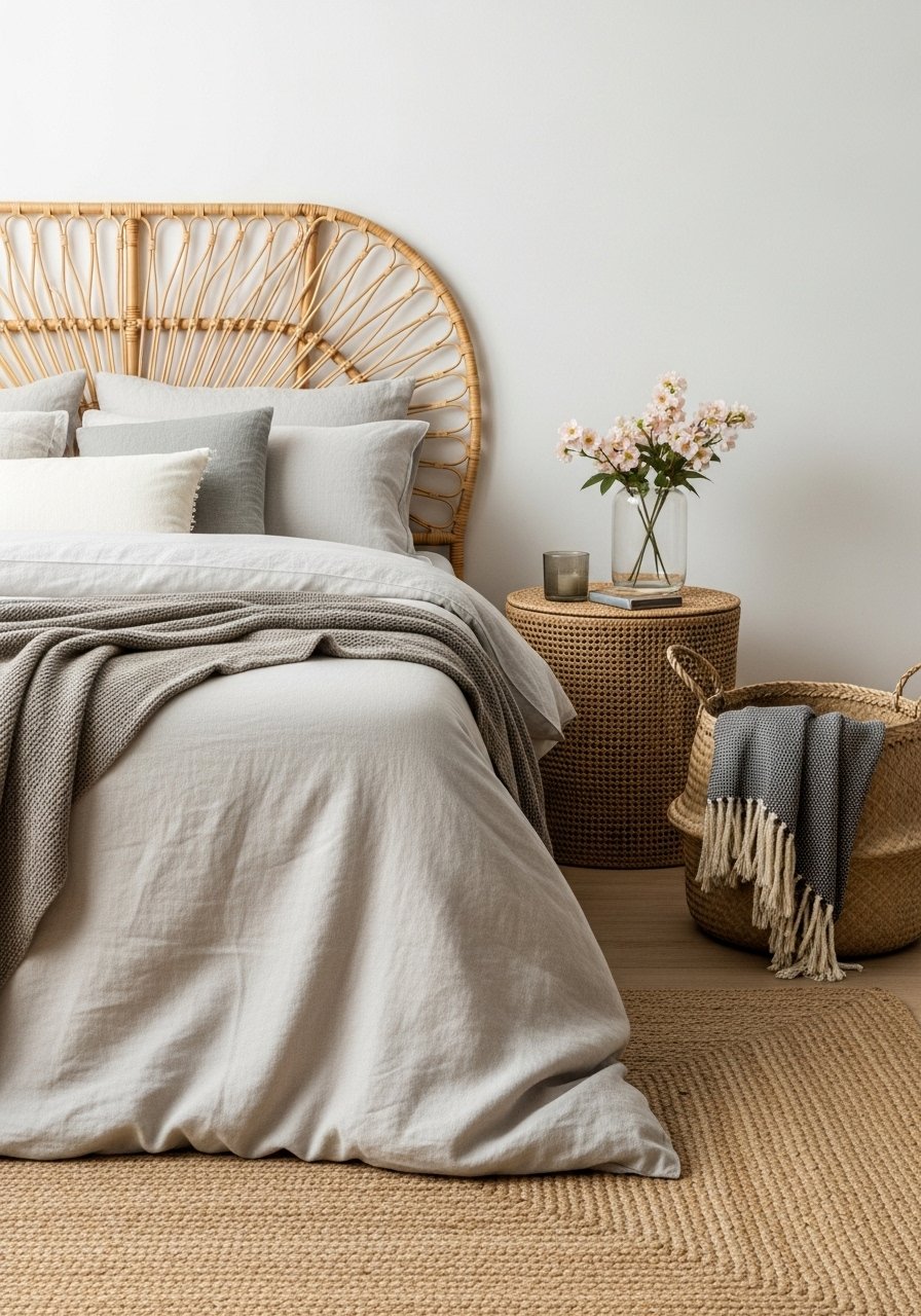 I paired a rattan headboard with linen sheets and a jute rug. The combo feels warm and collected. Use round jute rug 6-foot and neutral linens. Avoid too many pattern clashes—keep prints in one area.