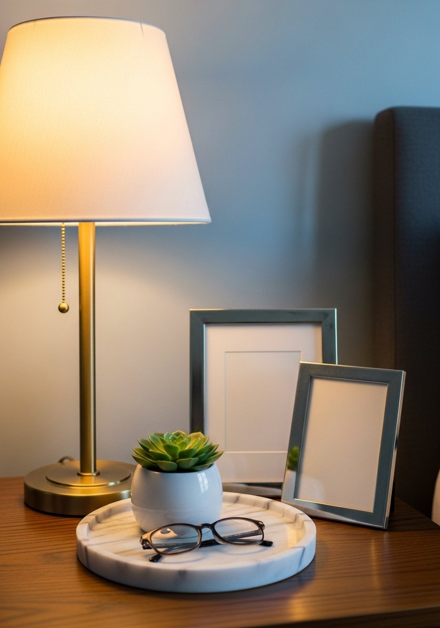 A single dimmable lamp and one stack of books makes the bedside feel curated. I use a dimmable bedside table lamp and a faux small snake plant for low upkeep. Mistake: cluttering the surface—keep essentials only.