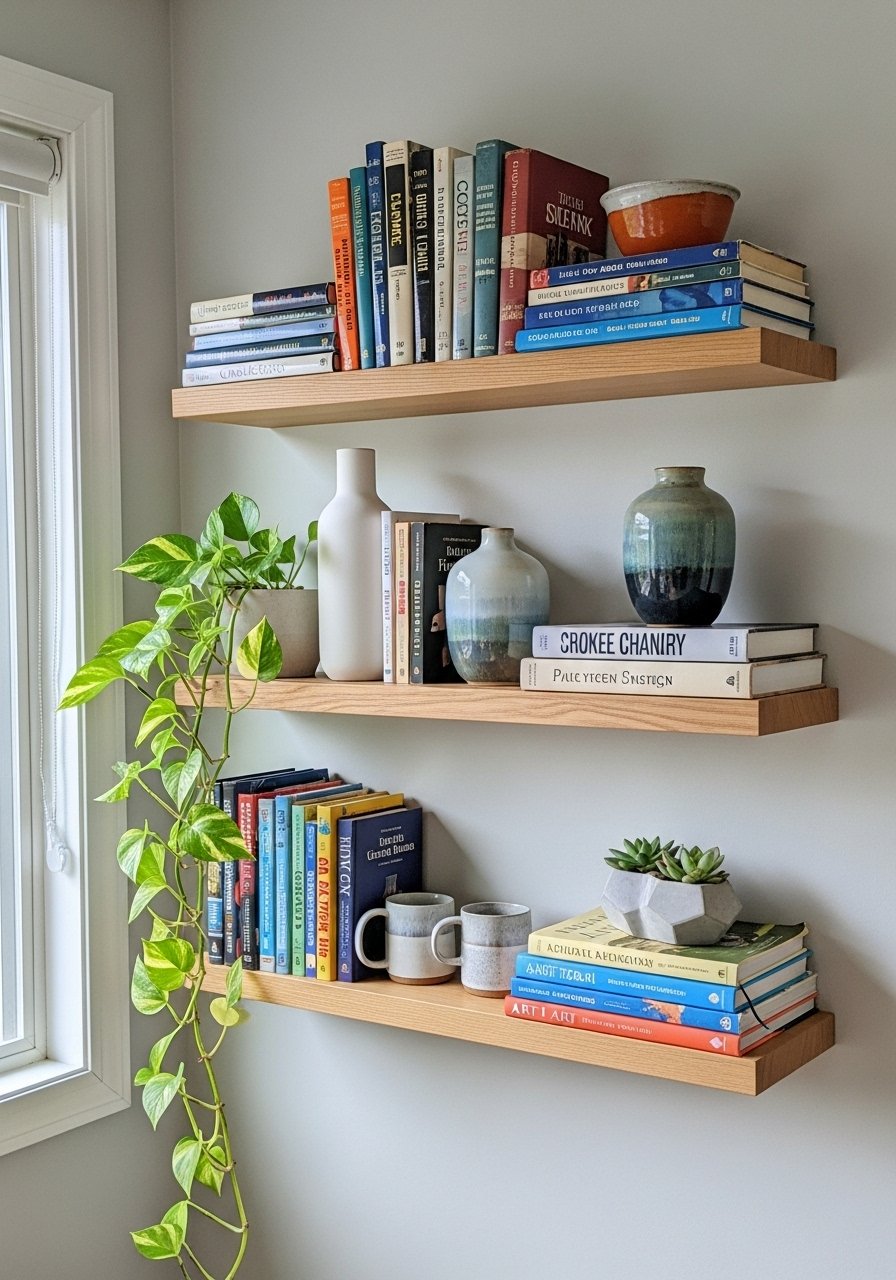 Floating shelves give storage with a clean line. I mounted white oak floating shelves and styled with odd-number groupings. Use varying heights and add a small plant for movement. Avoid over-styling—leave breathing room.