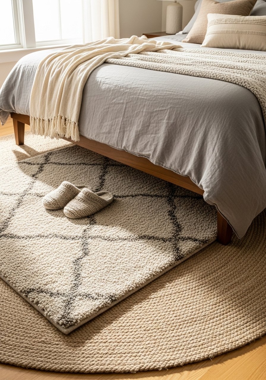 I layer a plush 5×7 rug over a natural jute rug for softness and traction. I bought a plush area rug 5×7 and a jute round rug. The underlayer prevents slipping and adds dimension. Common mistake: choosing rugs the wrong scale—ensure at least front legs sit on the rug.