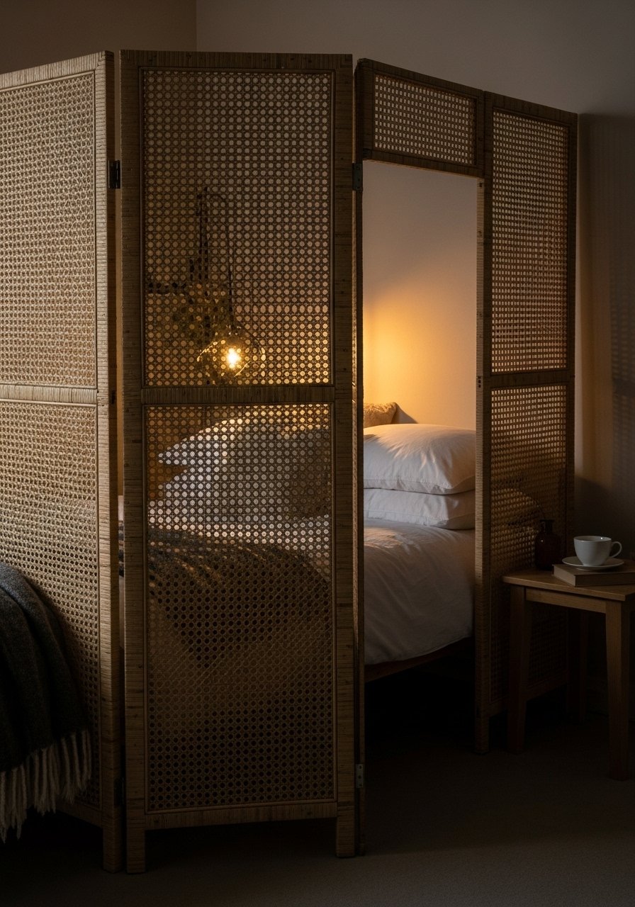 A rattan folding screen instantly reads like intentional decor. It’s lightweight and adds texture. I layered string lights behind mine for warmth. Styling tip: add a hanging plant to soften edges. Avoid too-small screens; they look like props.