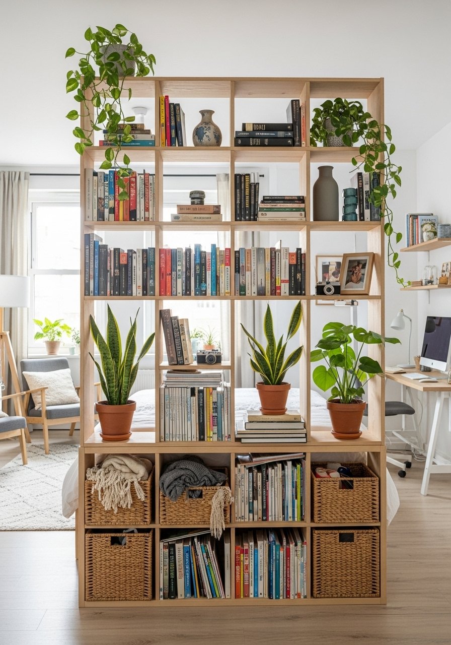 I split my studio with a tall bookcase (72-inch). It gives privacy and doubles as storage. Use baskets and a curated mix of books and art to avoid a “student” feel. Mistake: overfilling shelves—leave negative space for a cleaner look. Brands I like: IKEA and Target for budget options; West Elm for a warmer finish.