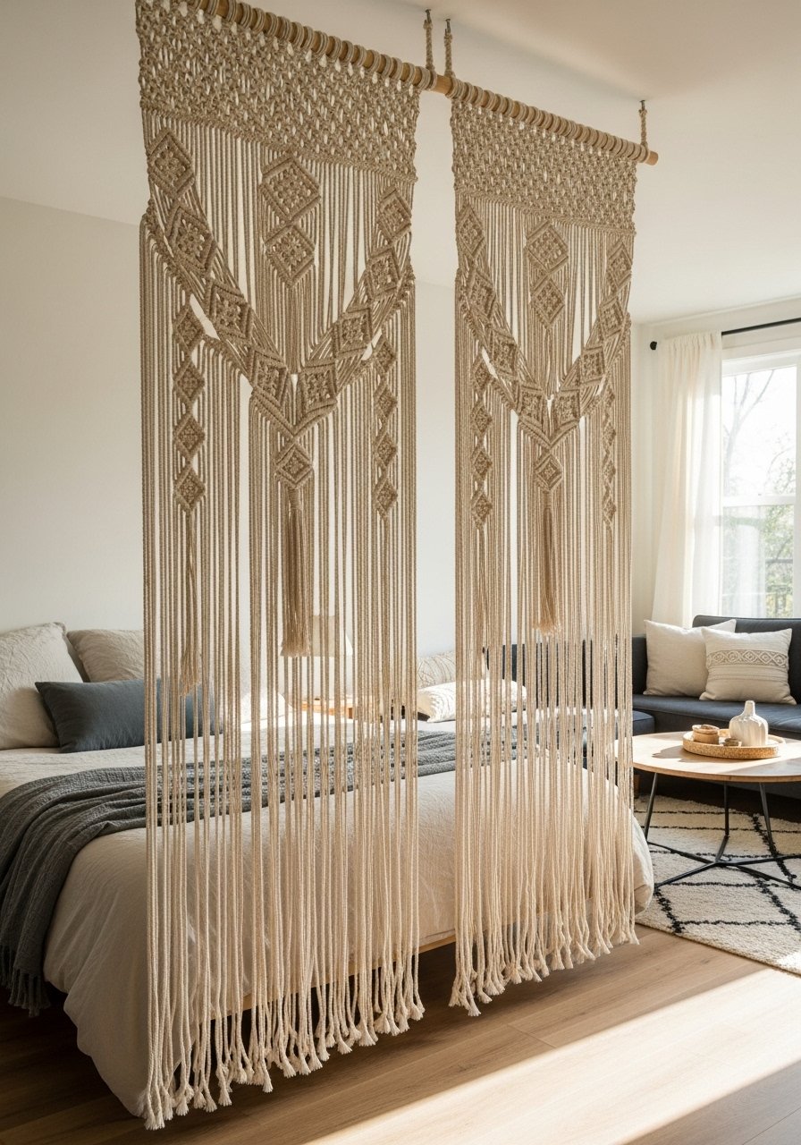 I hung macrame panels suspended from a ceiling hook. The look is breezy and adds a tactile layer without blocking light. Pair with a slim pendant light. Mistake: using panels that are too dense—keep gaps for airflow.
