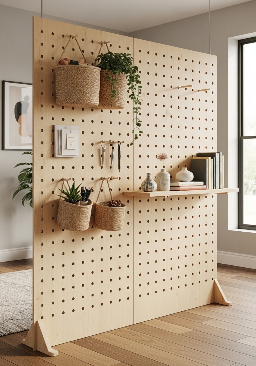 Pegboard Wall with Hanging Baskets for Flexible Partition