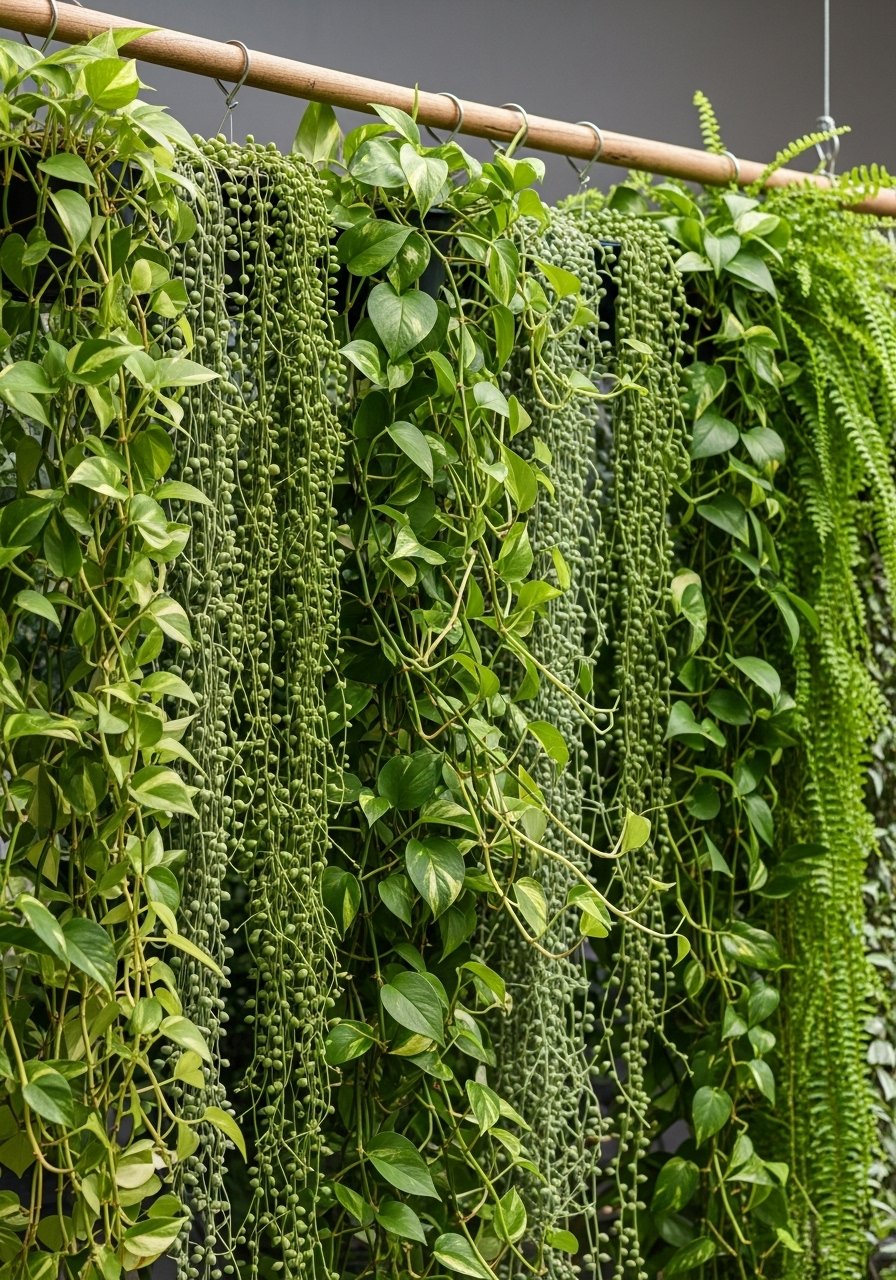 I strung hanging planters on a thin rod to make a living divider. A single tall faux fiddle leaf in the corner anchors the look. Mistake: too many small pots—use 2:1 size ratio (two small + one large).