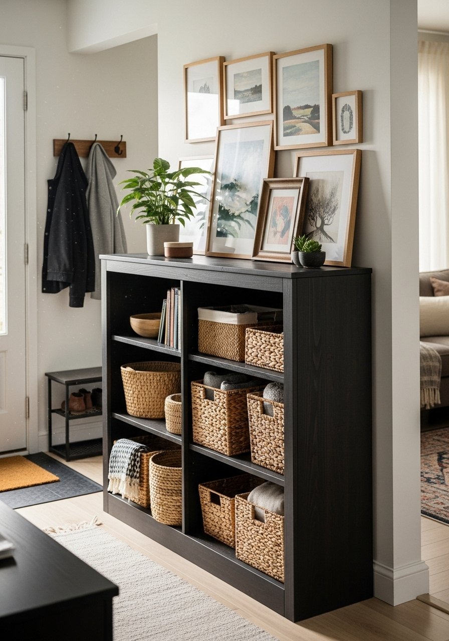 I built a low 24-inch bookcase into my half wall. It defines the entry, holds baskets for mittens, and reads as furniture not a barrier. The wood grain warms the space and keeps sightlines open. I style with odd numbers—three baskets, two plants, one lamp. Common mistake: overfilling shelves. Leave negative space for a curated look. Works with mixed materials—rattan baskets, brass lamp from CB2, and a linen runner.