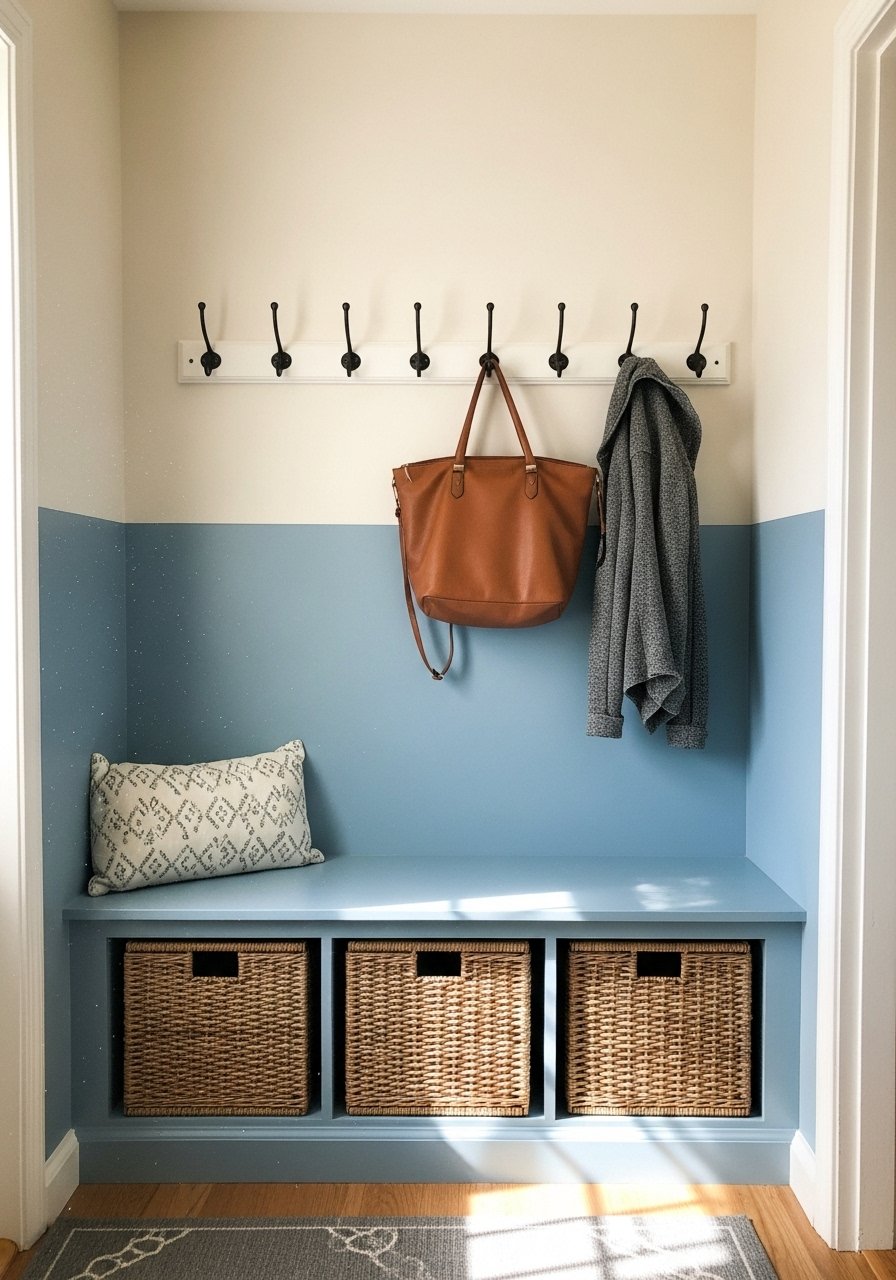 I turned the half wall into a small mudroom: a 36-inch storage bench, brass hooks, and basket cubbies. It corrals clutter and still reads open. Tip: keep bench depth under 18 inches if space is tight. Common mistake: shallow hooks that don’t hold coats—choose sturdy hardware.