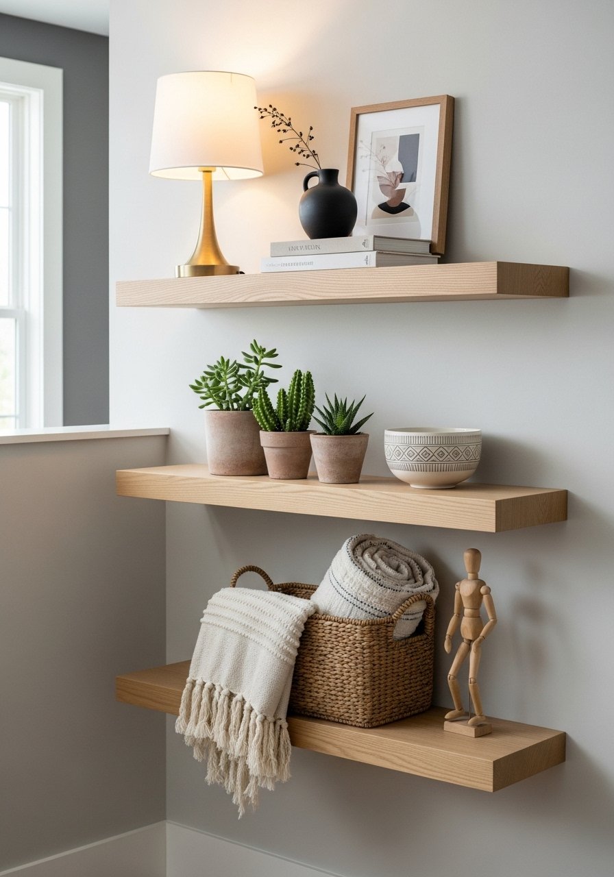 - White oak is current: White oak floating shelves read fresh and light.