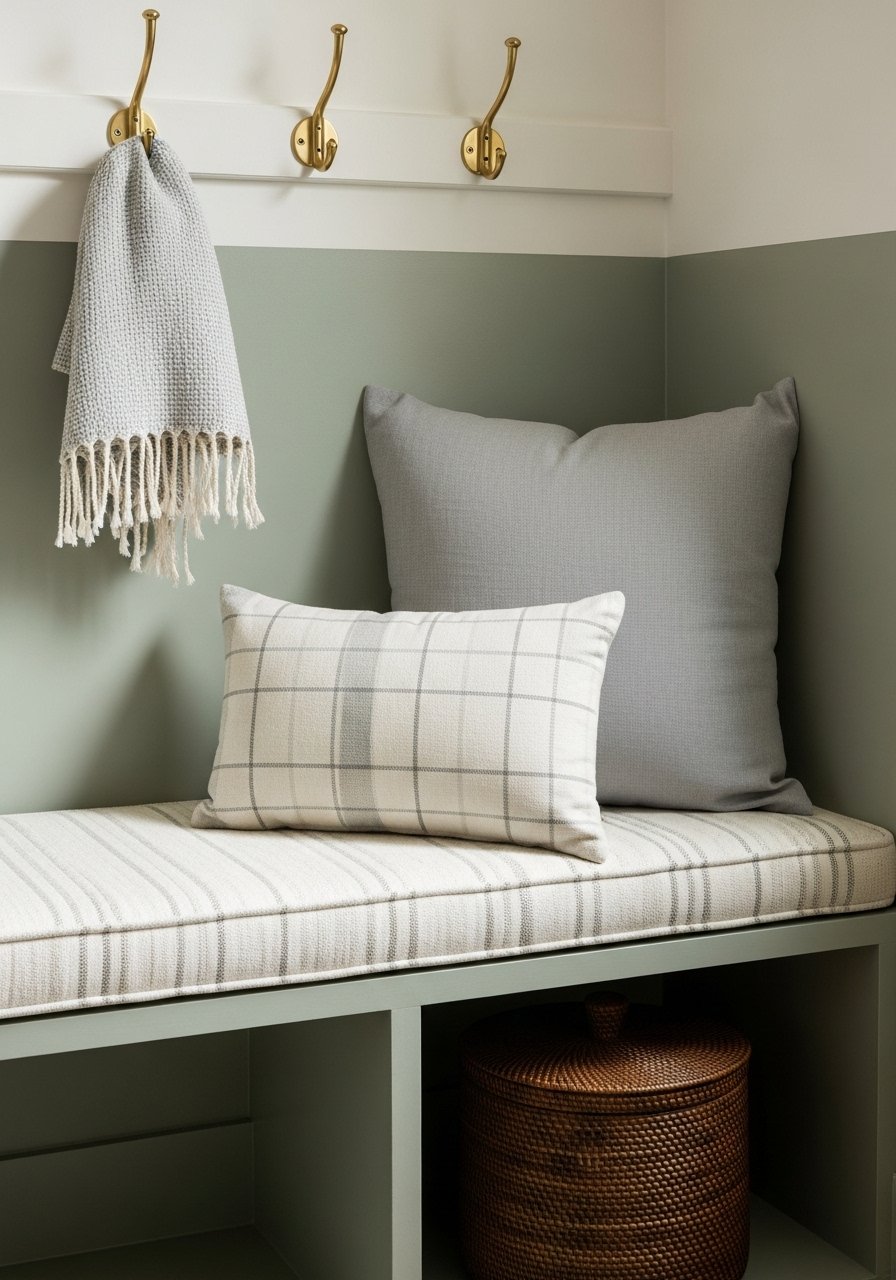 I built a low bench along the half wall and mounted a 5-hook rail above. The bench hides shoes inside a 2-shelf cubby. I used bench cushions in a linen blend and woven baskets underneath. The result feels grounded and welcoming. Tip: pick hooks about 5–6 feet high. Mistake to avoid: crowding hooks — leave negative space so coats hang neatly.