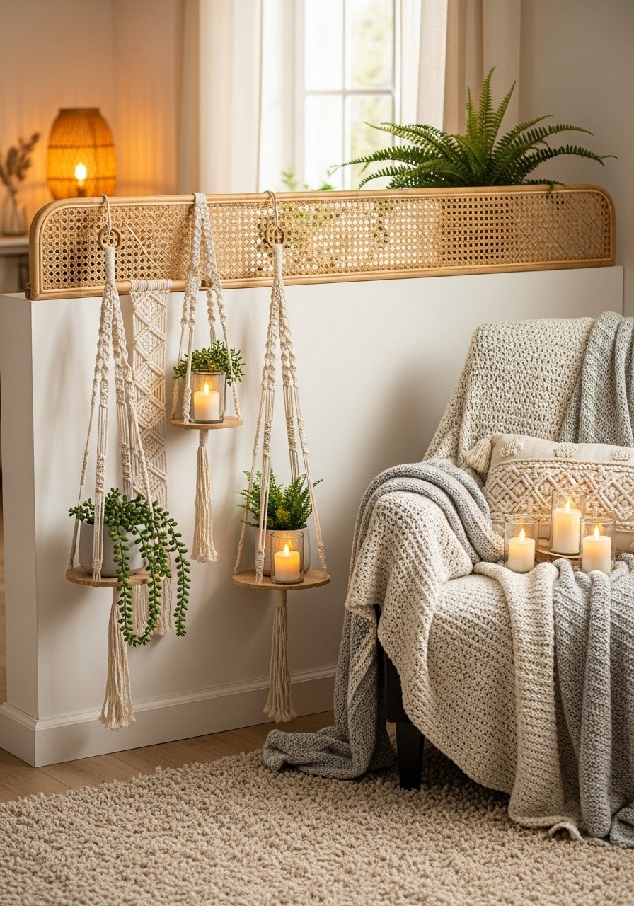 I topped my half wall with a rattan screen and hung woven shelves for plants. It softens sightlines and adds texture. Use rattan panels and small hanging rope shelves. This creates a cozy, layered look. Mistake: too many small plants — pick two statement pieces.
