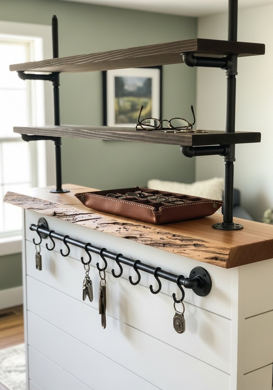 The pipe shelf is sturdy and doubles as a ledge for mail and sunglasses. I mounted industrial pipe brackets and a stained pine top. Pair with leather catch-alls and metal hooks. Visual impact: masculine and utilitarian. Mistake: skip shallow screws; anchor into studs.