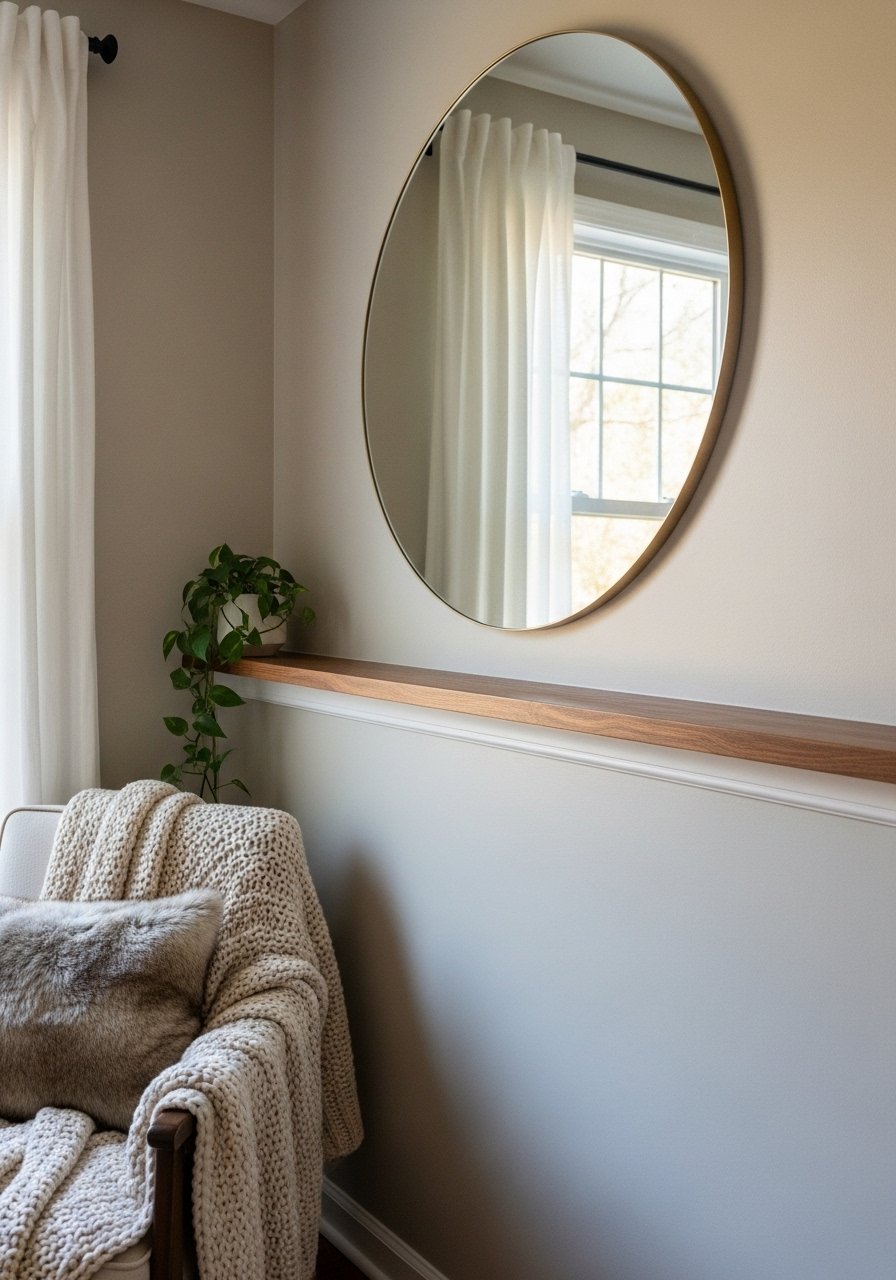 A 36" round mirror above a slim shelf opens a small entry. I used large round mirror 36-inch and a narrow ledge for keys. The mirror bounces light and visually doubles the space. Mistake: hanging mirror too low; top third should align with eye level.