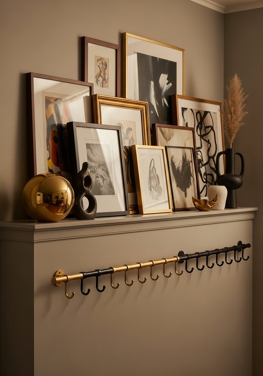 I mixed brass hooks and black frames on a narrow gallery ledge. It feels curated, not fussy. Try mixed metal picture frames and a brass hook rail. Tip: stick to 2:1 metal balance (warm:cool). Mistake: matching every metal — contrast adds depth.