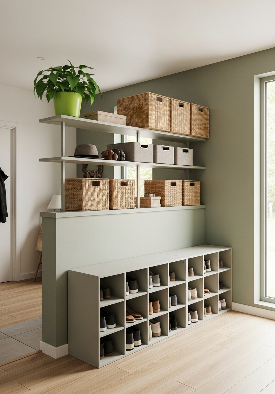 I stacked a 2-cubby bench under the half wall and added open shelves. The cubby corrals shoes while shelves display essentials. Use shoe cubby bench and small storage bins. Mistake: tiny cubbies that don’t fit adult shoes—measure first.