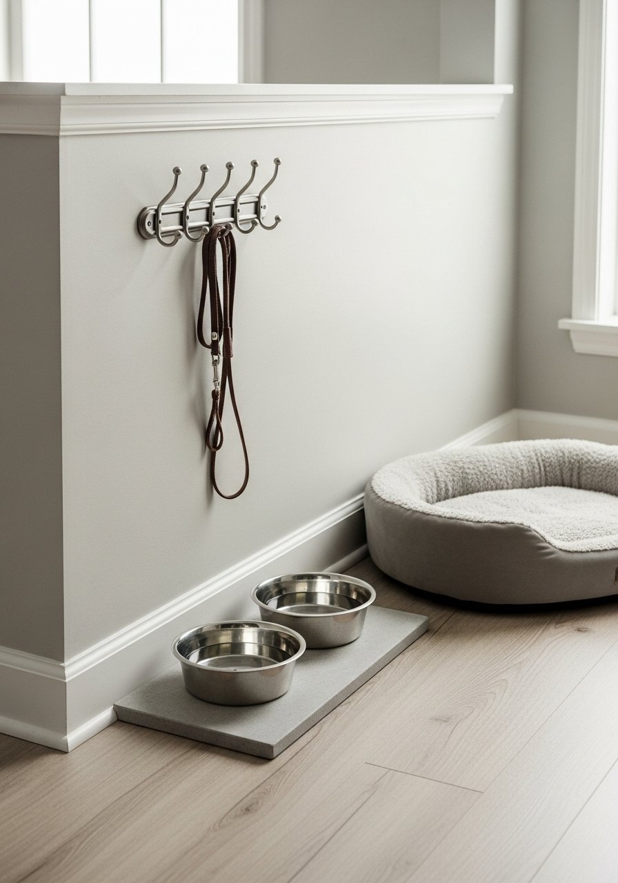I added a dedicated leash hook and a recessed nook for bowls inside the half wall. A wall leash hook and a slide-out tray keep the area tidy. This stops pet gear from cluttering the kitchen. Mistake: placing bowls in a high-traffic zone — choose a quieter corner.
