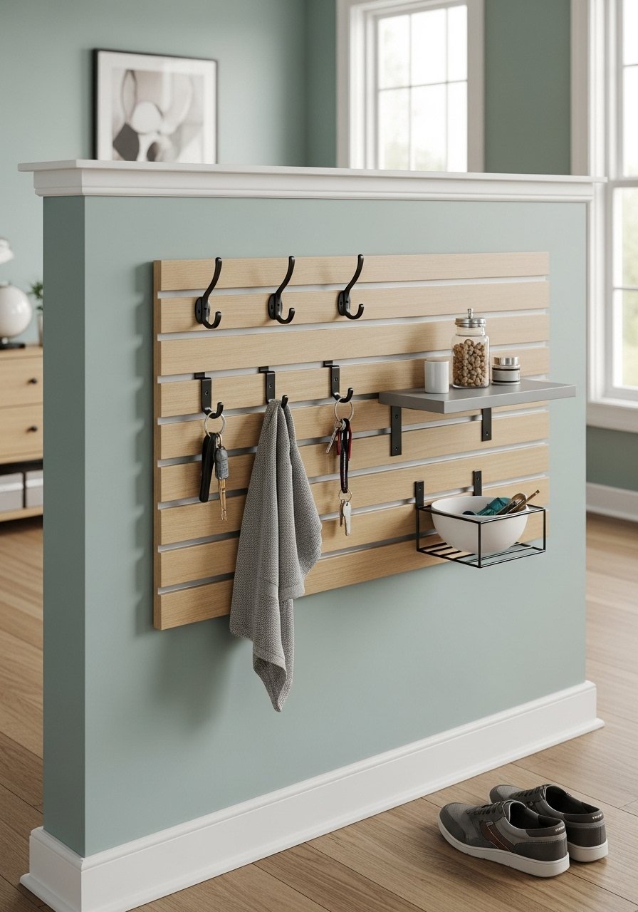I use a magnetic slatwall panel mounted on the half wall. Hooks, baskets, and a small shelf slide anywhere. It’s flexible when needs change and great for renters. Mistake: overloading one area—spread weight across multiple anchors.