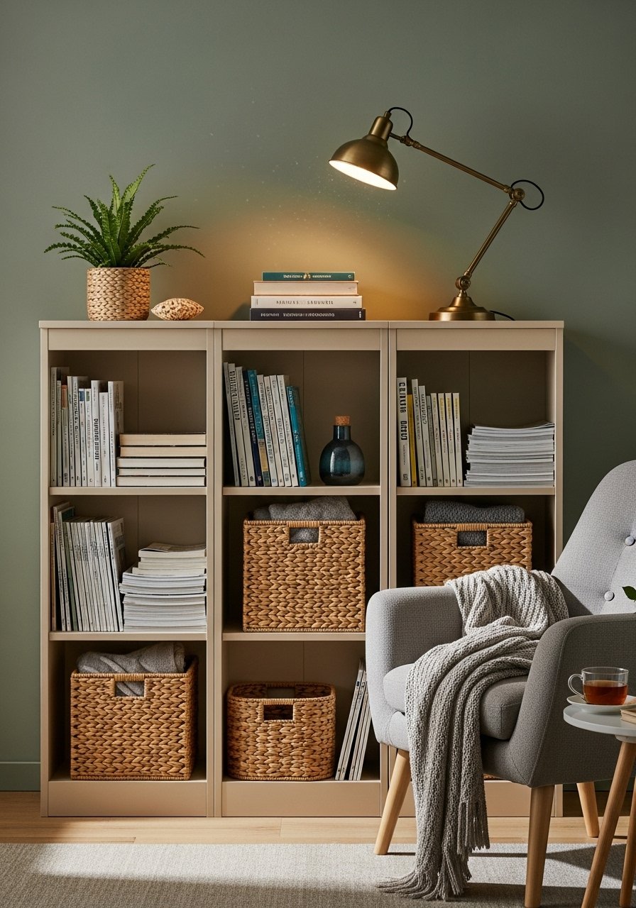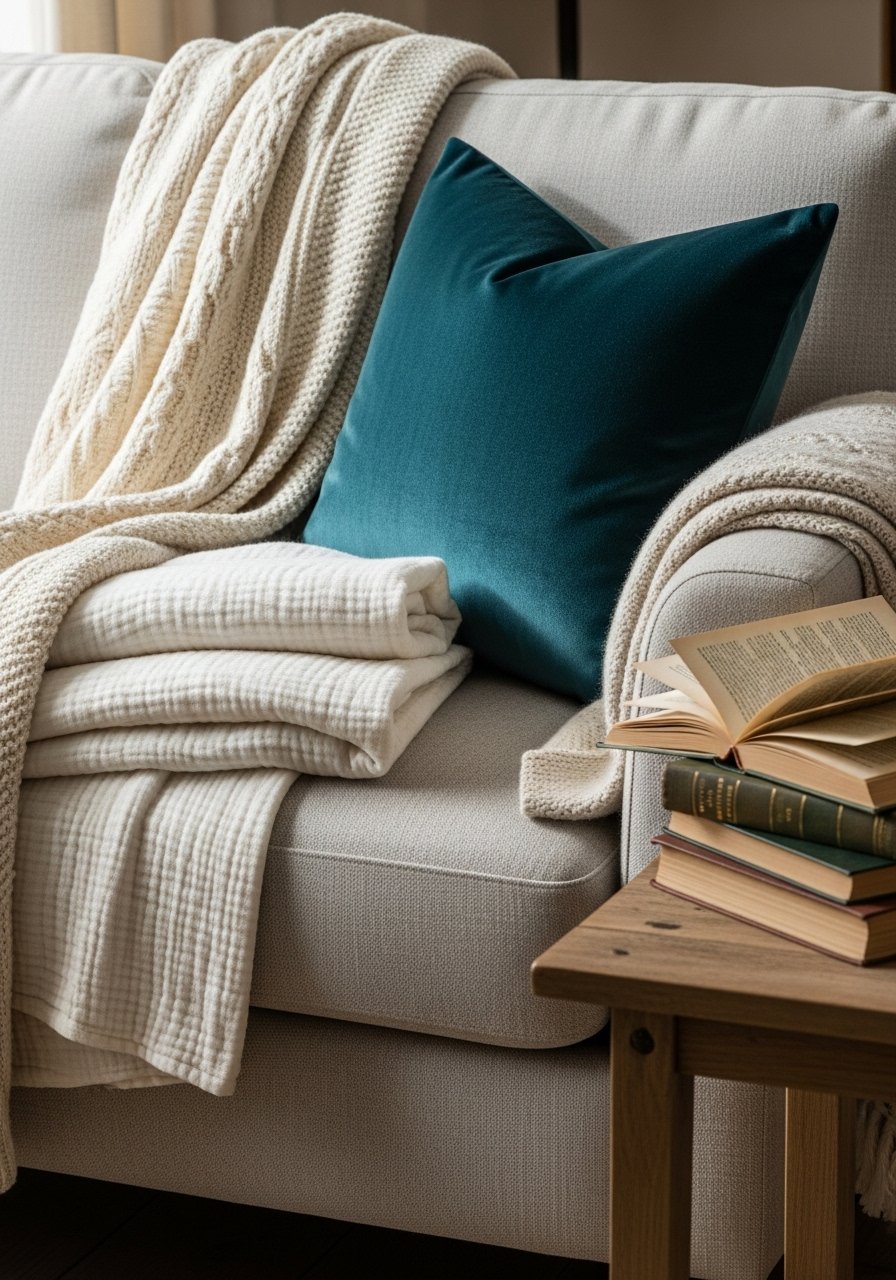 I used creams, beige, and a single deep-teal pillow to anchor the shelves. The rule of 3 textures worked: linen curtains, chunky knit throw, and jute rug. I added velvet pillow covers in deep teal and a chunky knit throw. It feels calm, but not boring. Avoid too many accent colors—one bold tone is enough. In photos, every pillow looks perfect; in real life choose fabrics you can wash.