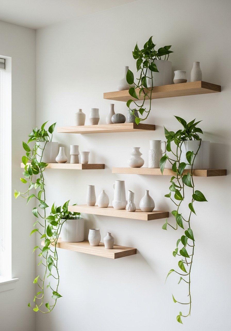 I staggered three shelves in odd numbers and mixed books with small succulents in ceramic pots. Height variation matters—taller plant on one end, stack of books on the other. Avoid matching everything; mismatched ceramics add charm.
