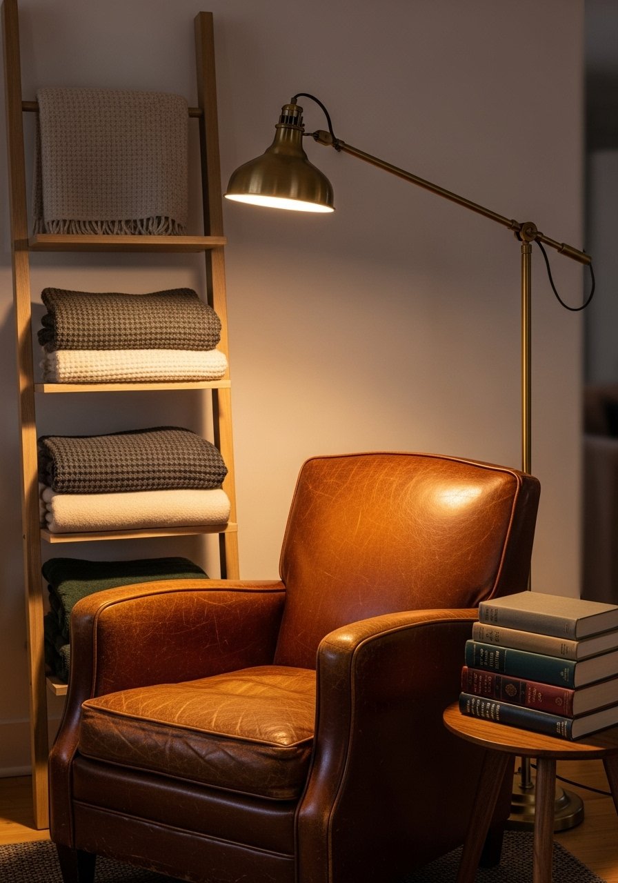 I leaned an oak ladder blanket shelf behind my chair and draped a chunky throw. A brass swing arm sconce gives directed light. Result: instant invitation to sit. Mistake to avoid: too-bright bulbs—choose warm LED Edison bulbs.