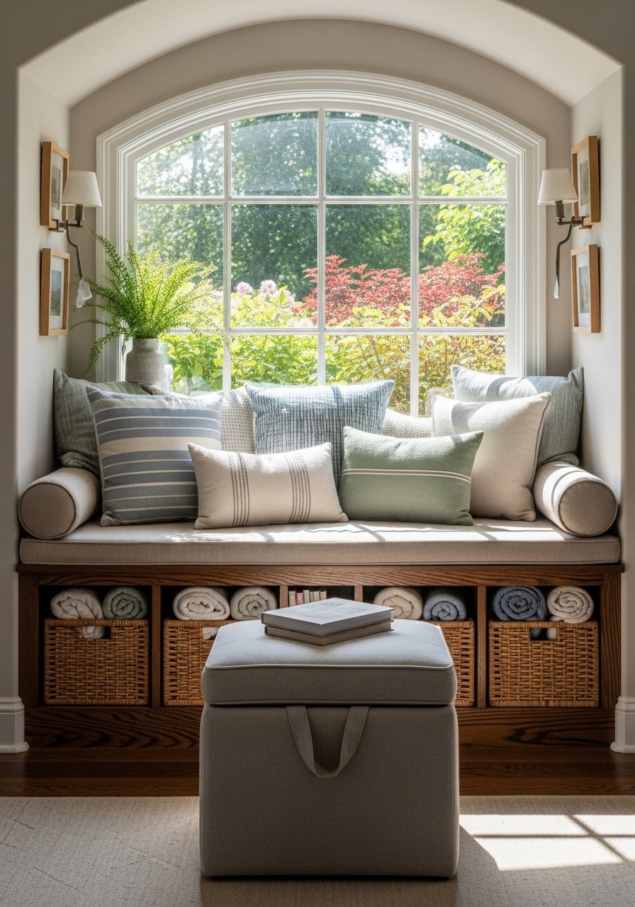 I used a 48-inch storage ottoman linen as a seat, added pillows, and stashed blankets inside. It’s both seating and book storage. Measure depth before buying. Avoid a seat that’s too shallow.