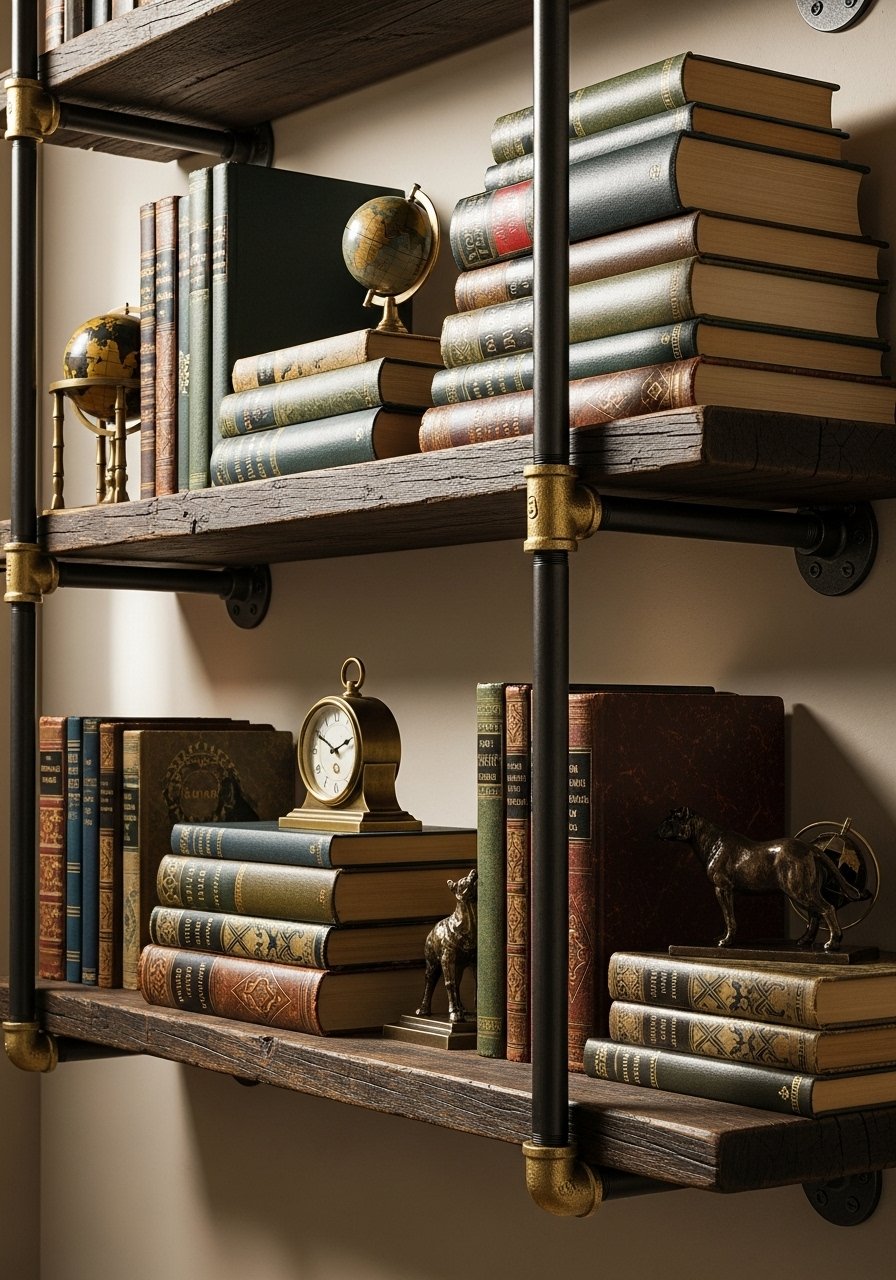 I paired reclaimed wood with industrial pipe shelf brackets. Works well with metal frames and leather. Keep display balanced—mix books and objects. Pitfall: too many tiny objects look messy; use larger pieces.