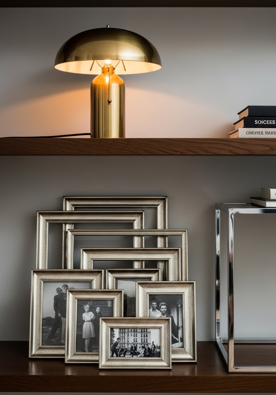 I mixed warm brass with cool nickel—lamp in brass, frames in mixed metal. Mixed metal picture frames made coordination easy. The result felt layered and current. Avoid matching everything perfectly.