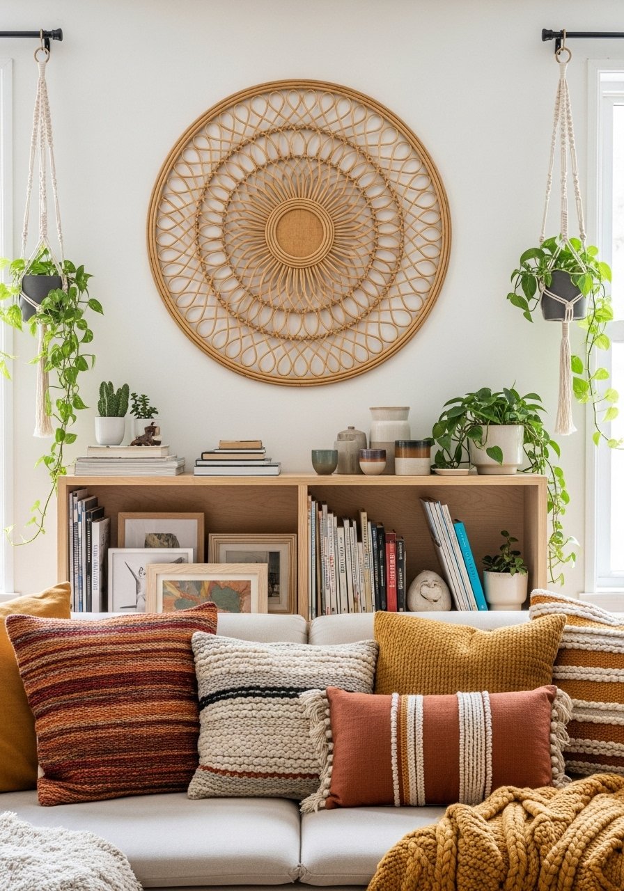 I hung a large rattan piece and several macramé planters for texture. Add a round jute rug 6 foot and a few ceramics. This reads relaxed and tactile. Avoid too many bright colors—stick to earth tones.