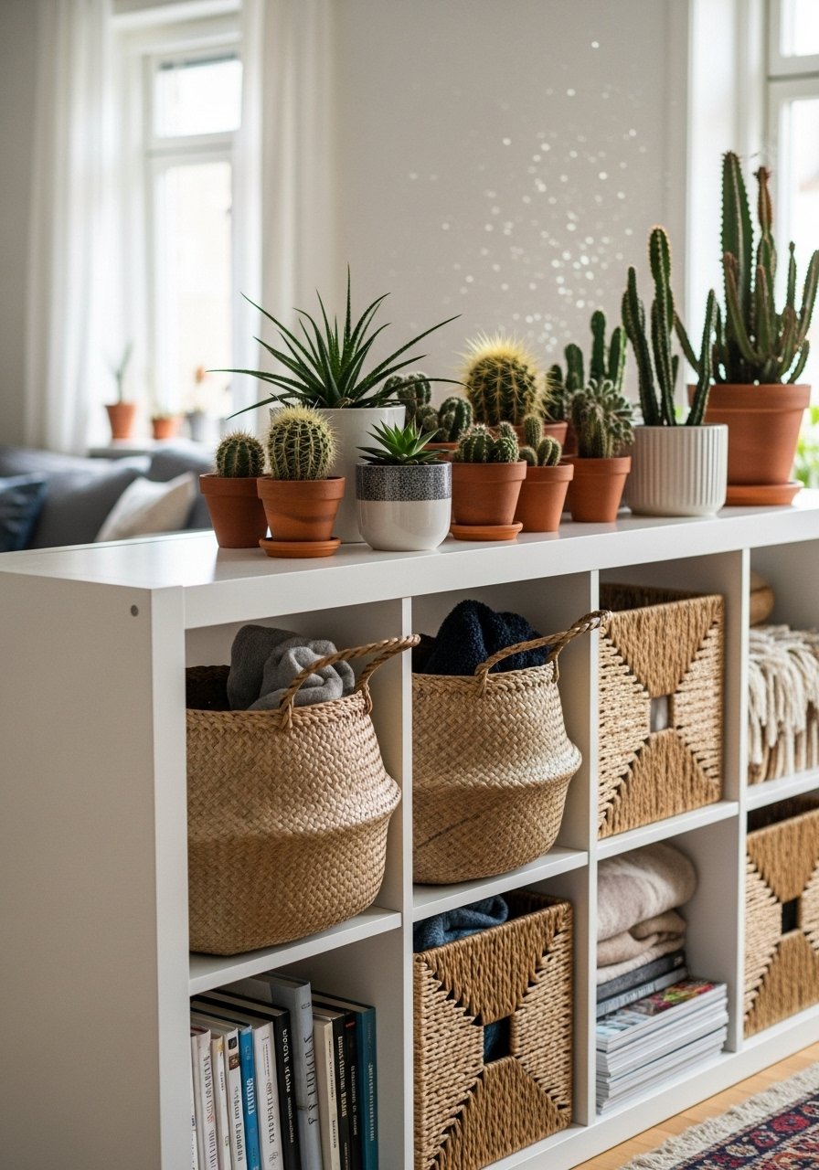 I used a white Kallax turned sideways to split my studio. I left the middle cubes open and added woven baskets on the lower row for hidden storage. On the living-room-facing side I styled books and a round mirror. On the office side I mounted a small pegboard for supplies. The result reads custom because of symmetry and consistent materials: white finish, natural fiber baskets, and low-profile brass handles. Styling tip: use odd numbers of decor per cube and vary heights. Mistake to avoid: overfilling every shelf—leave breathing room so the divider reads intentional. Links: Kallax search, woven storage baskets.