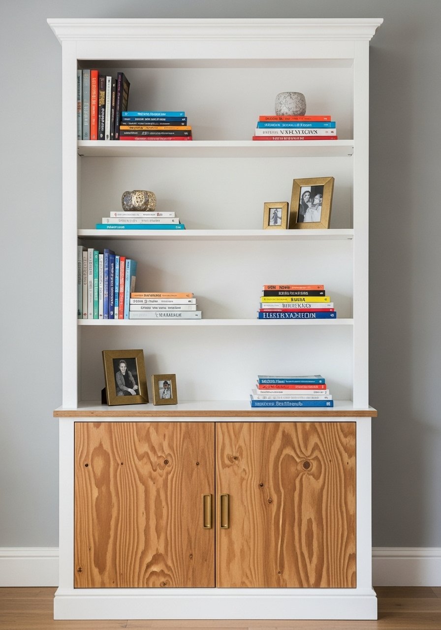 I added shallow plywood doors to the bottom half of a Billy unit for a built-in look. Paint the doors in a soft gray to match trim. The covered storage hides clutter and keeps the divider looking clean from both sides. Tip: install soft-close hinges for a polished feel. Mistake: don’t use tiny knobs—choose low-profile pulls or flush cutouts. Recommended: tall white bookcase.