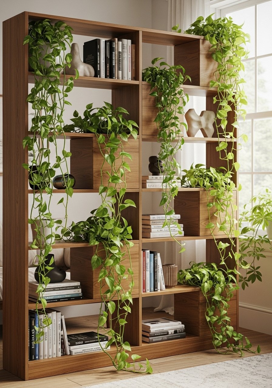 I converted select shelves into planters with waterproof liners and trailing plants. It creates a green screen without a full wall. Use a mix of real and high-quality faux for low maintenance. Styling tip: arrange tall plants at ends and trailing in the middle. Mistake: skipping drainage—use trays under pots. Links: macrame plant hanger set, artificial fiddle leaf fig tree.