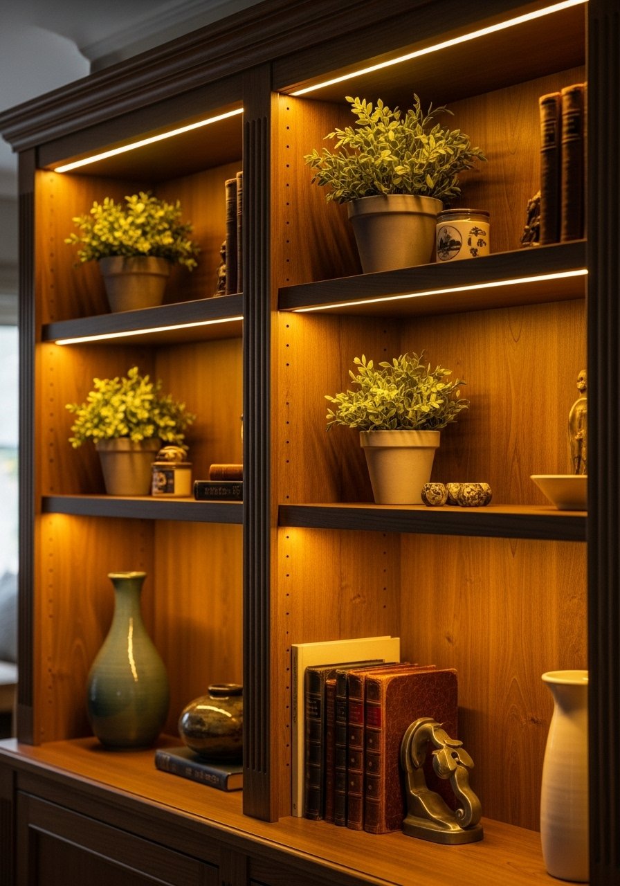 I ran warm LED strips down the inside of a bookcase divider. The glow reads like built-in lighting at a fraction of the cost. Use dimmable strips and warm white (2700K–3000K). Mistake: bright cool LEDs—they read harsh. Link: led strip lights warm white.
