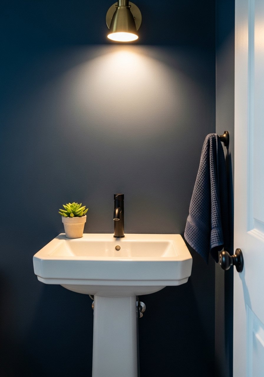 I painted one wall Hale Navy in my guest powder room and it finally felt intentional. Dark indigo creates drama without covering every surface. Pair with a large round mirror (36-inch round mirror brass frame) and matte-black fixtures to keep contrast crisp. Styling tip: keep textiles light—white hand towels and a navy mat balance the look (2:1 light-to-dark textiles works well). Mistake to avoid: painting all four walls the same deep blue in a tiny room—you lose the contrast that opens the space.
