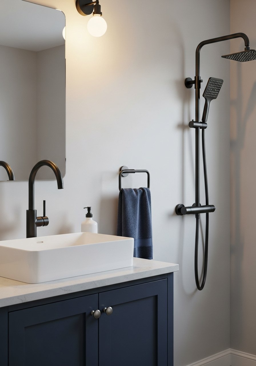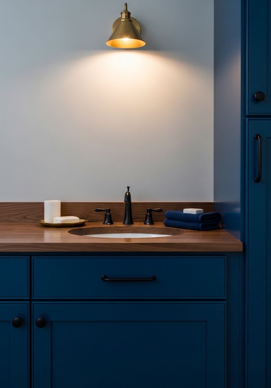 Switching to matte black hardware is the easiest high-contrast move. It reads modern with indigo blue and keeps the palette cohesive. I swapped my old chrome for a matte black faucet set and sprayed leftover towel bars with matte black spray paint for under $20. Pitfall: don’t mix too many metal finishes without repeating at least one metal twice.