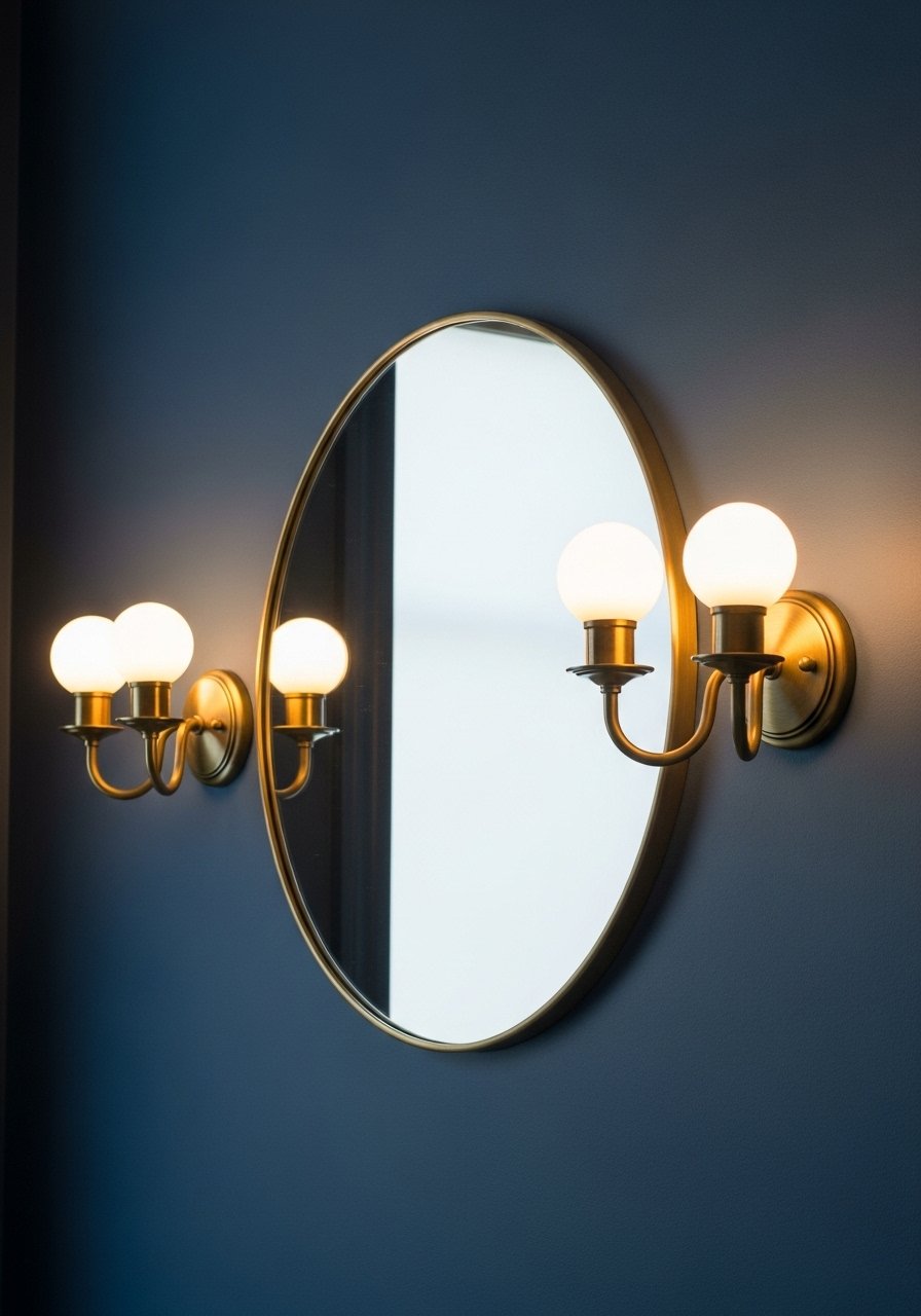 Indigo can feel cold. Brass sconces warm the palette instantly. I hung brass wall sconce pair and swapped bulbs to warm 2700K. Tip: stagger height—sconces 60–65 inches from floor or flanking mirror centerline. Avoid overly ornate fixtures; simple brass shapes read modern.