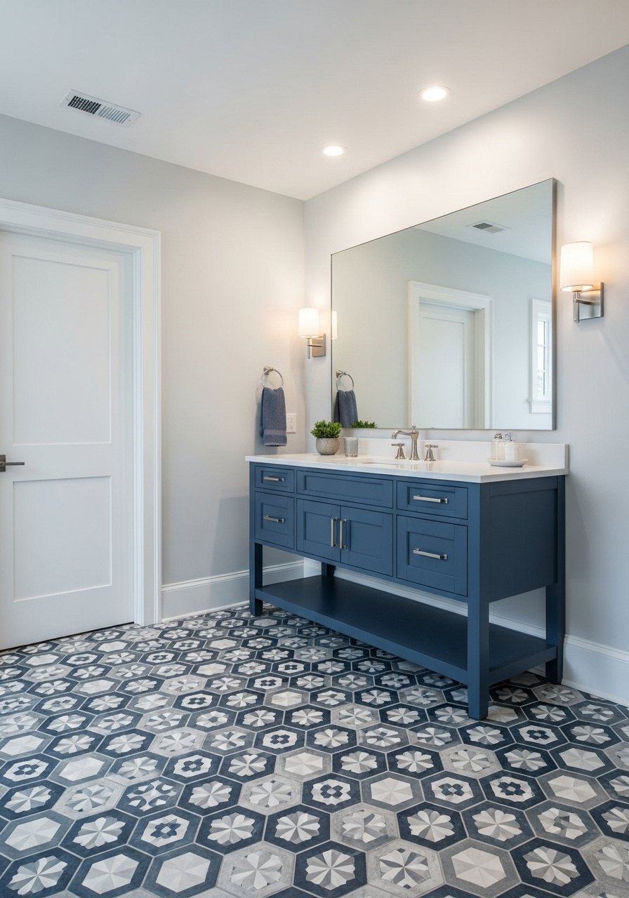 A bold hex floor in navy and white gives needed personality. I chose a matte encaustic look that hides water spots. Pair with plain white wall tile to keep focus on the floor. Practical note: patterned floors require simple walls—don't add more patterns nearby.