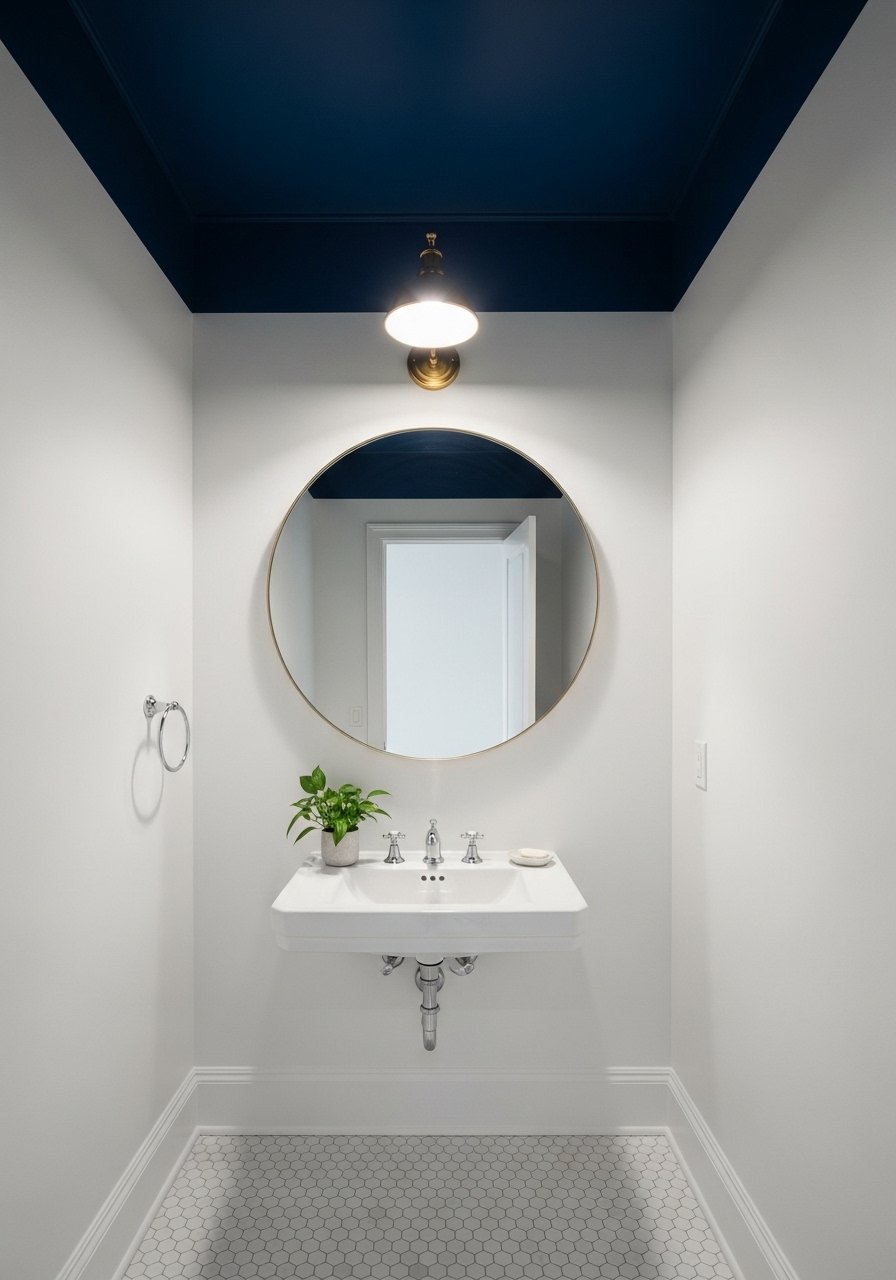 Painting the ceiling indigo made my small powder room feel intimate, not claustrophobic. It draws the eye up and frames the mirror. Use satin finish to hide imperfections. Mistake: avoid painting ceiling and all walls dark; keep walls light to preserve brightness.